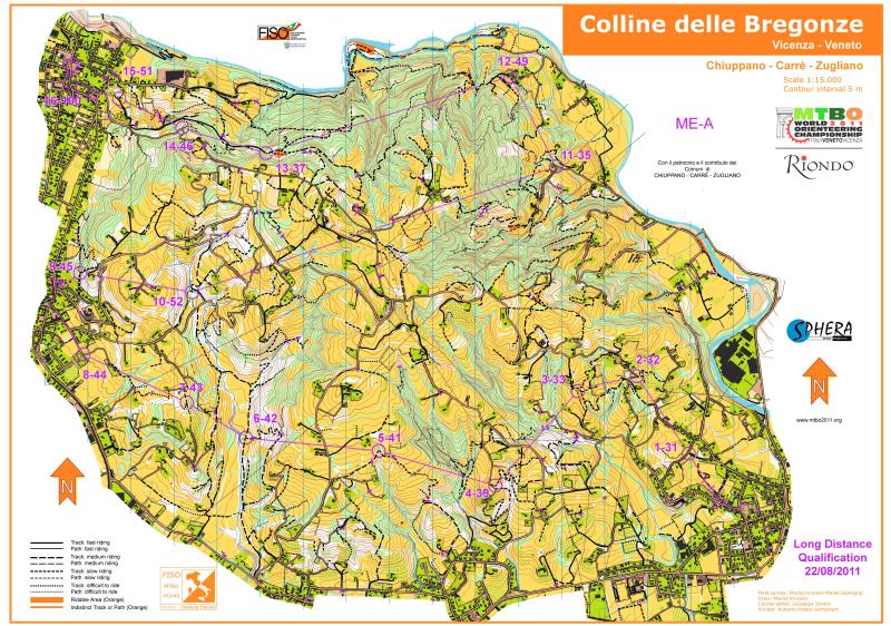 定向越野地图的运动员使用的是专门为定向运动制作的地图,显示比普通的远足地图更详细,即使很细小的地形特征,不明显的小径、河流等等,也会在定向地图中显示出来,以提供更多资料给运动员。由于参加者可能需要穿越有各种类型的场地,所以地图上会显示每个小区域所覆盖的植被状况,并相应地指出该区域的通行度(一个介于0 与1 之间的百分比数,数值越高表示通过时的难度越低)。一般地图上颜色越深的区域通行度越低。