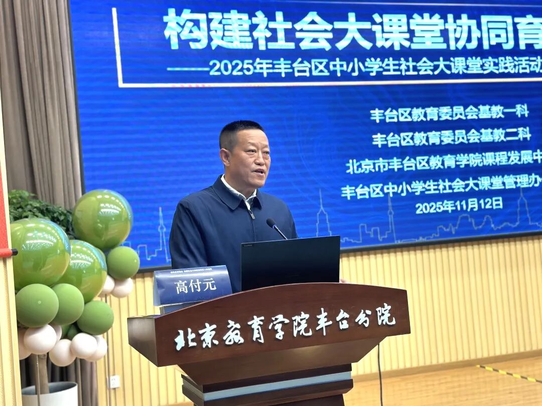 为深入落实立德树人根本任务,进一步发挥社会大课堂品牌效应,提升实践育人质量,丰台区中小学生社会大课堂管理办公室在丰台区教委基教一科、二科的指导下,于11月12日在丰台教育学院六里桥院区组织召开主题为“深化五育融合 构建社会大课堂协同育人新格局”2025年丰台区中小学生社会大课堂实践活动师生成果交流研讨会。原北京市中小学生社会大课堂管理办公室主任、北京市校外教育学会秘书长高付元,丰台教委基教二科“七个一”活动负责人王沁艳、北京市丰台区教育学院副院长刘婧、丰台教育学院课程发展中心副主任王志强,丰台区各学校社会大课堂工作主管领导,以及丰台区各资源单位相关负责人共同参加了此次活动。会议由课程发展中心李沂桐老师主持。