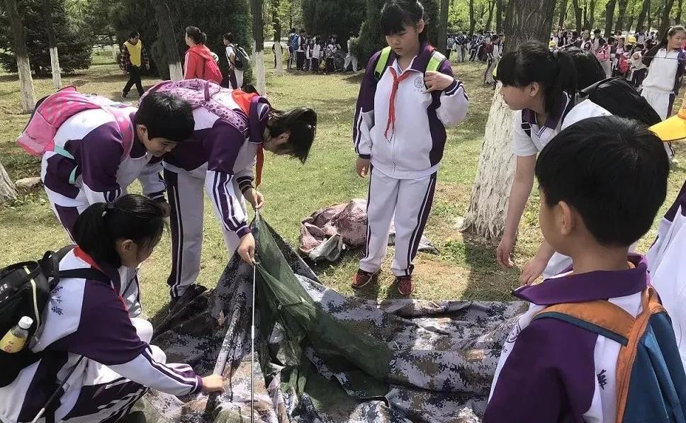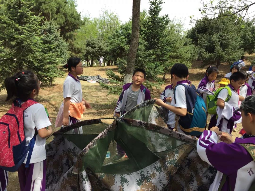 4月24日,迎着明媚的阳光,全体师生抵达青龙湖公园,同学们在老师的带领下,“大手拉小手”组成互助小组,在团结协作中共同学习搭建帐篷,建立自己的营地。
