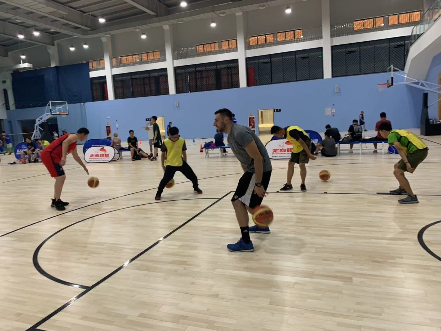 训练第二项——运球练习,球感练习完后紧接着开始运球练习,单手原地高低运球、背后运球、胯下运球、体前变向运球等。