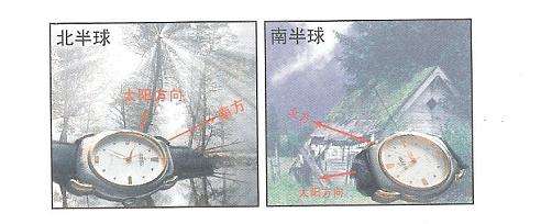 2)太阳-手表 利用太阳定向时,手表同样可以发挥作用。早晨6时太阳在东方,将手表的时针指向太阳,此时表盘上的“12”便指向西方;如果“3”对向太阳,“12”便指向北方;中午12时,太阳位于南方,表盘上“6”对向太阳,则“12”指向北方。