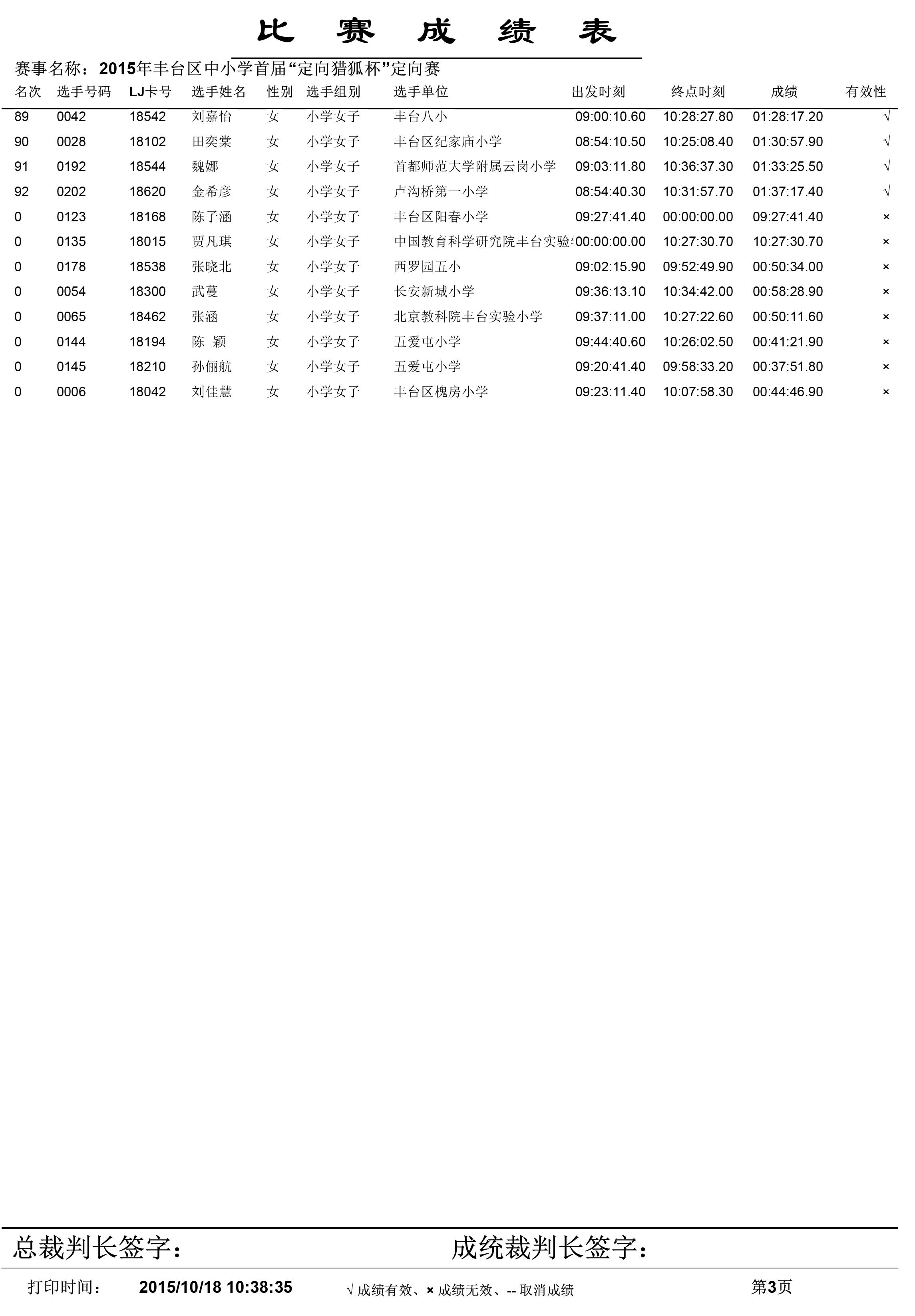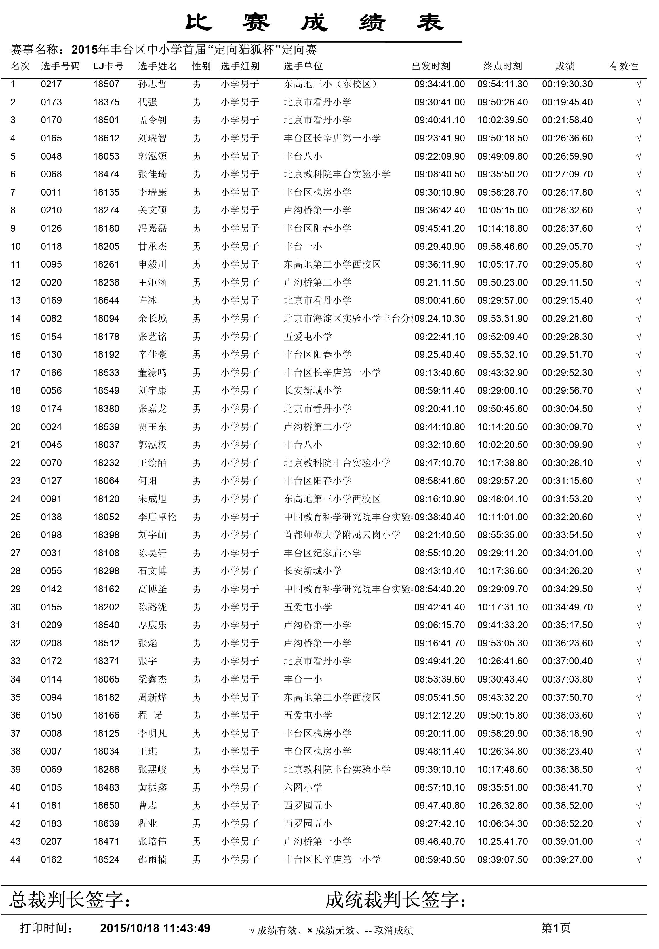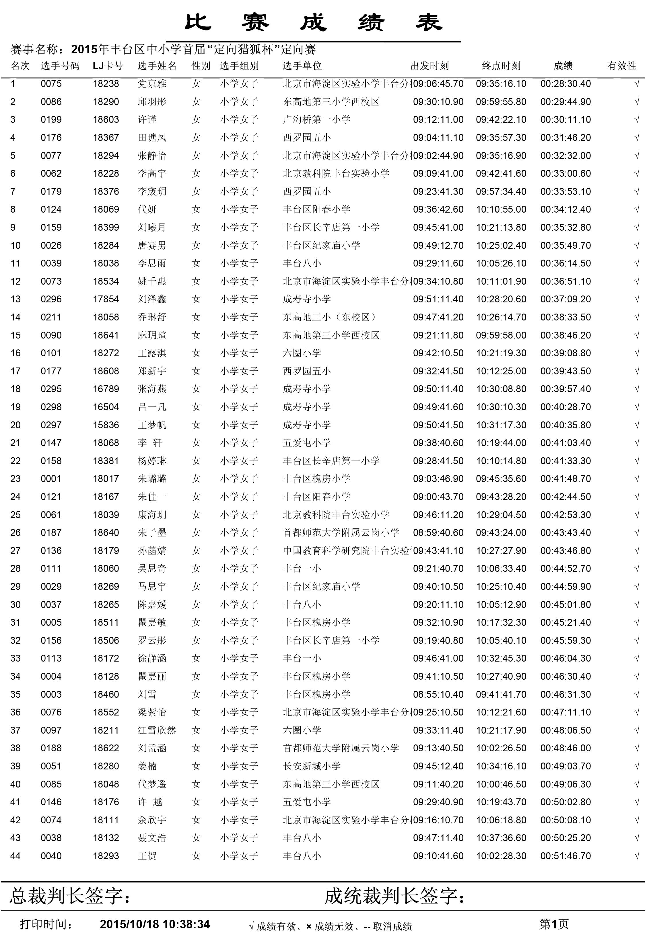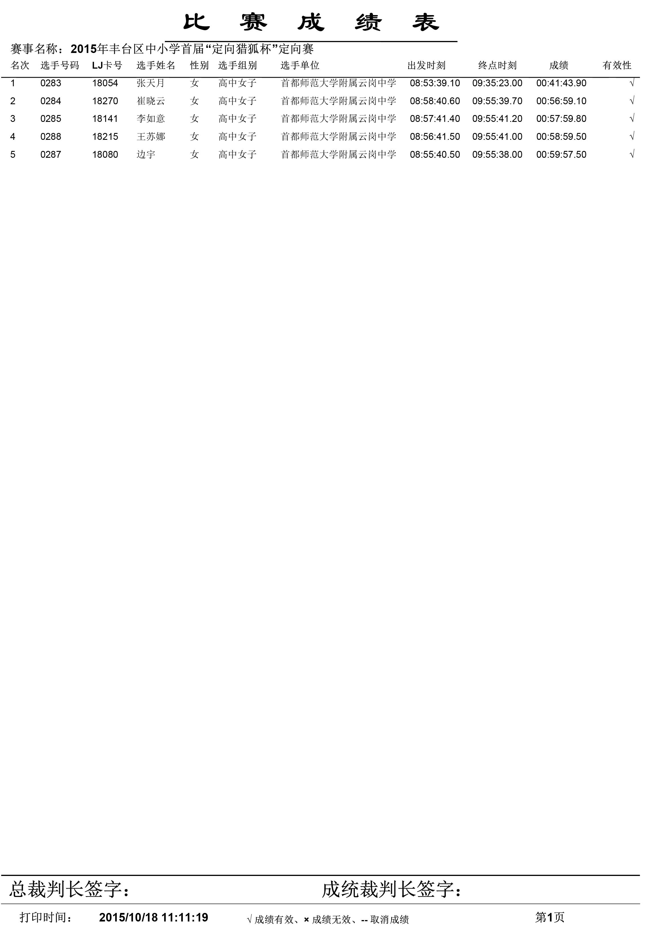 2015年丰台区中小学生首届“定向猎狐杯”定向越野锦标赛成绩单