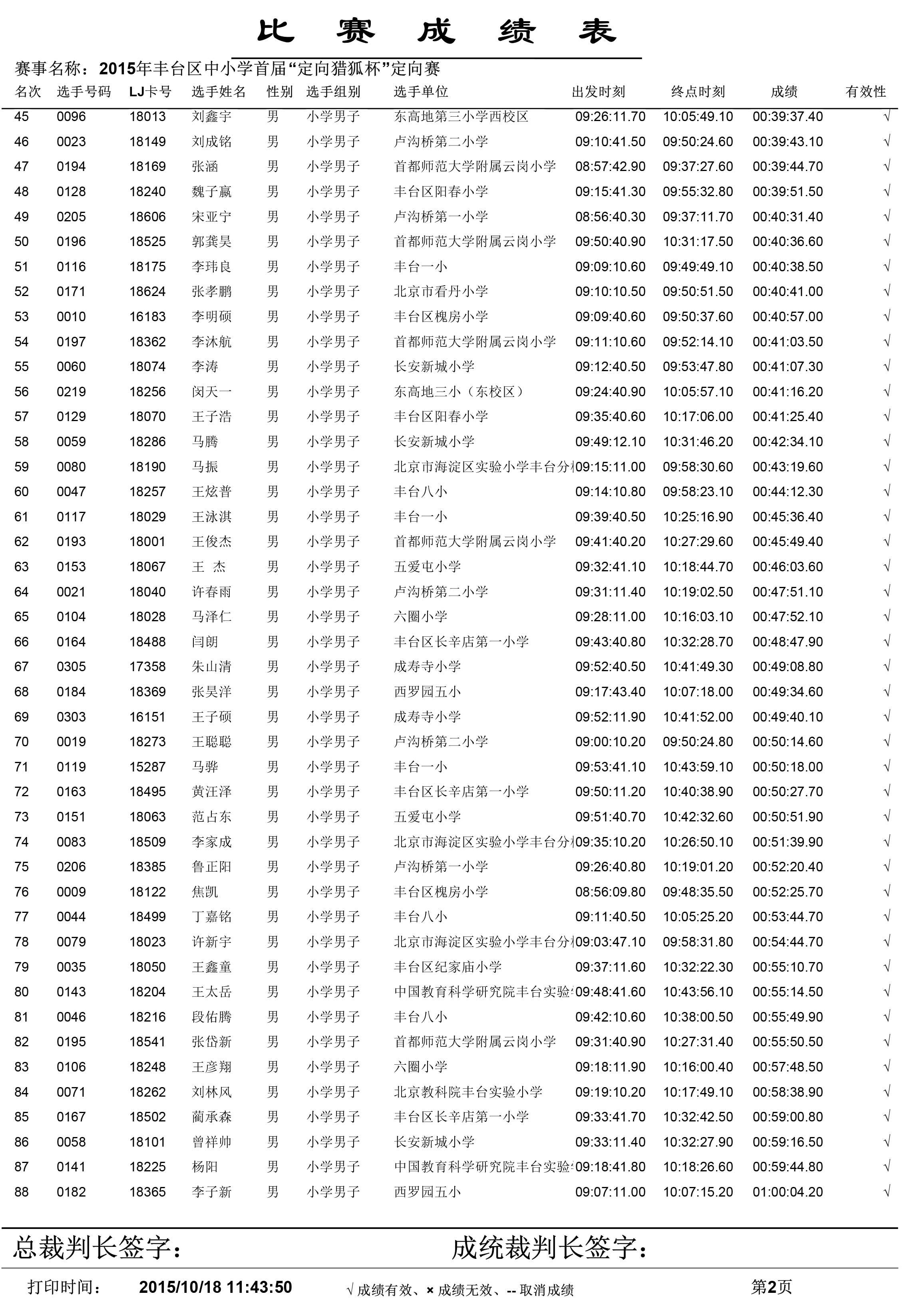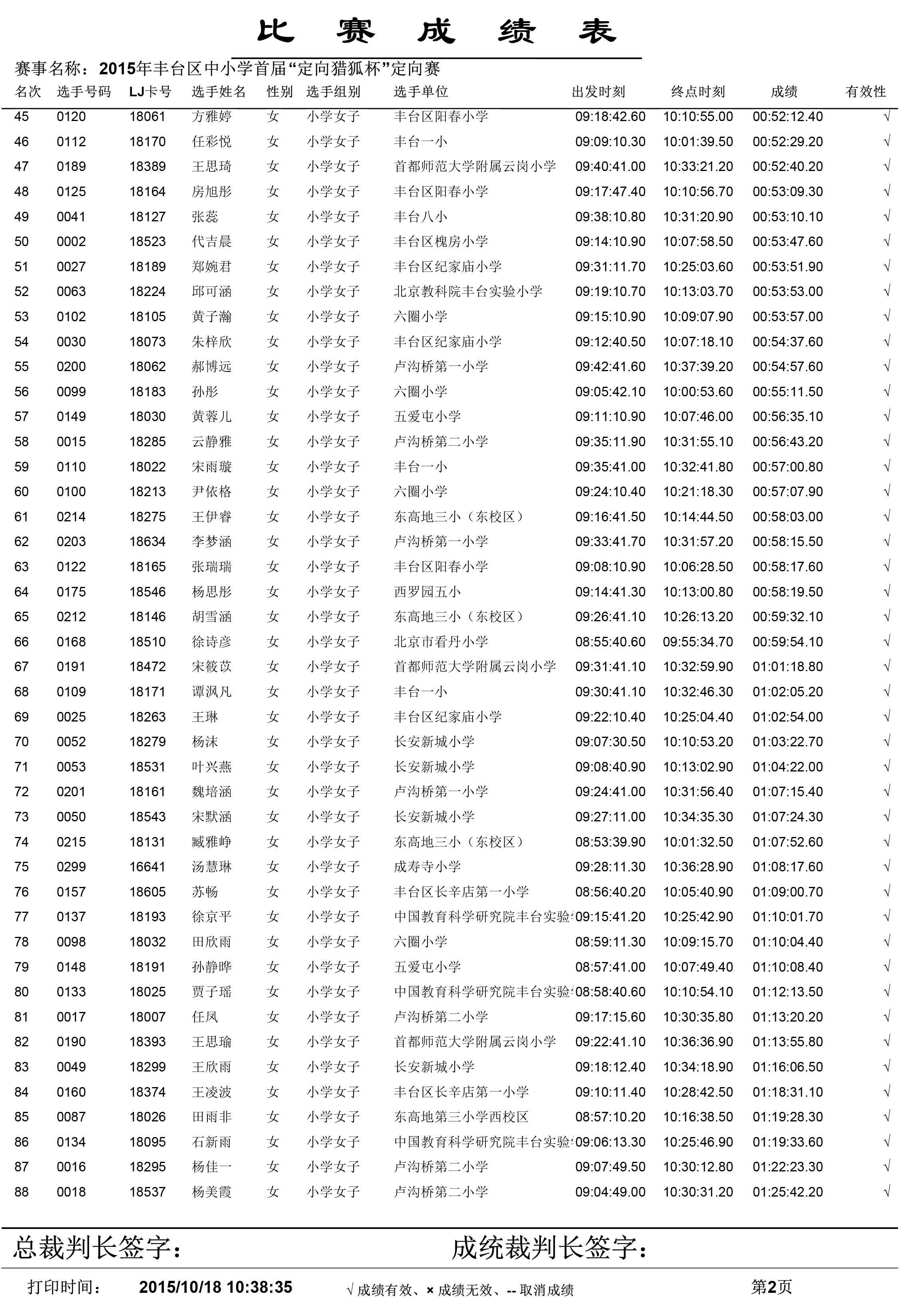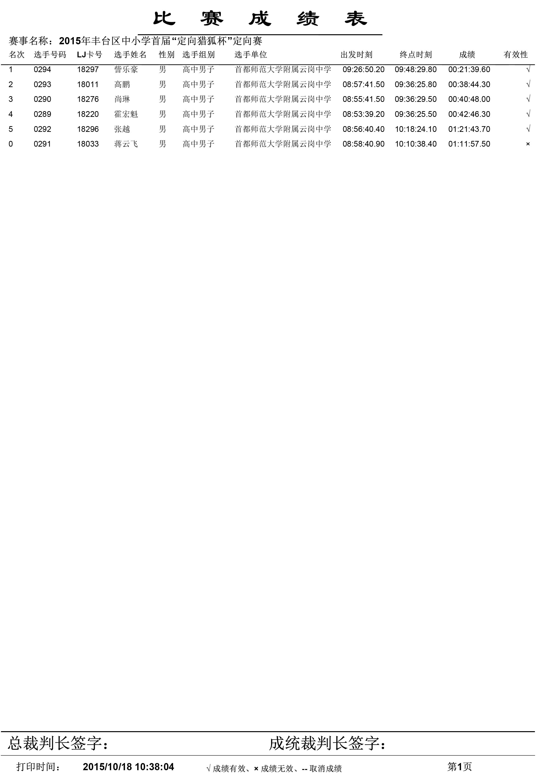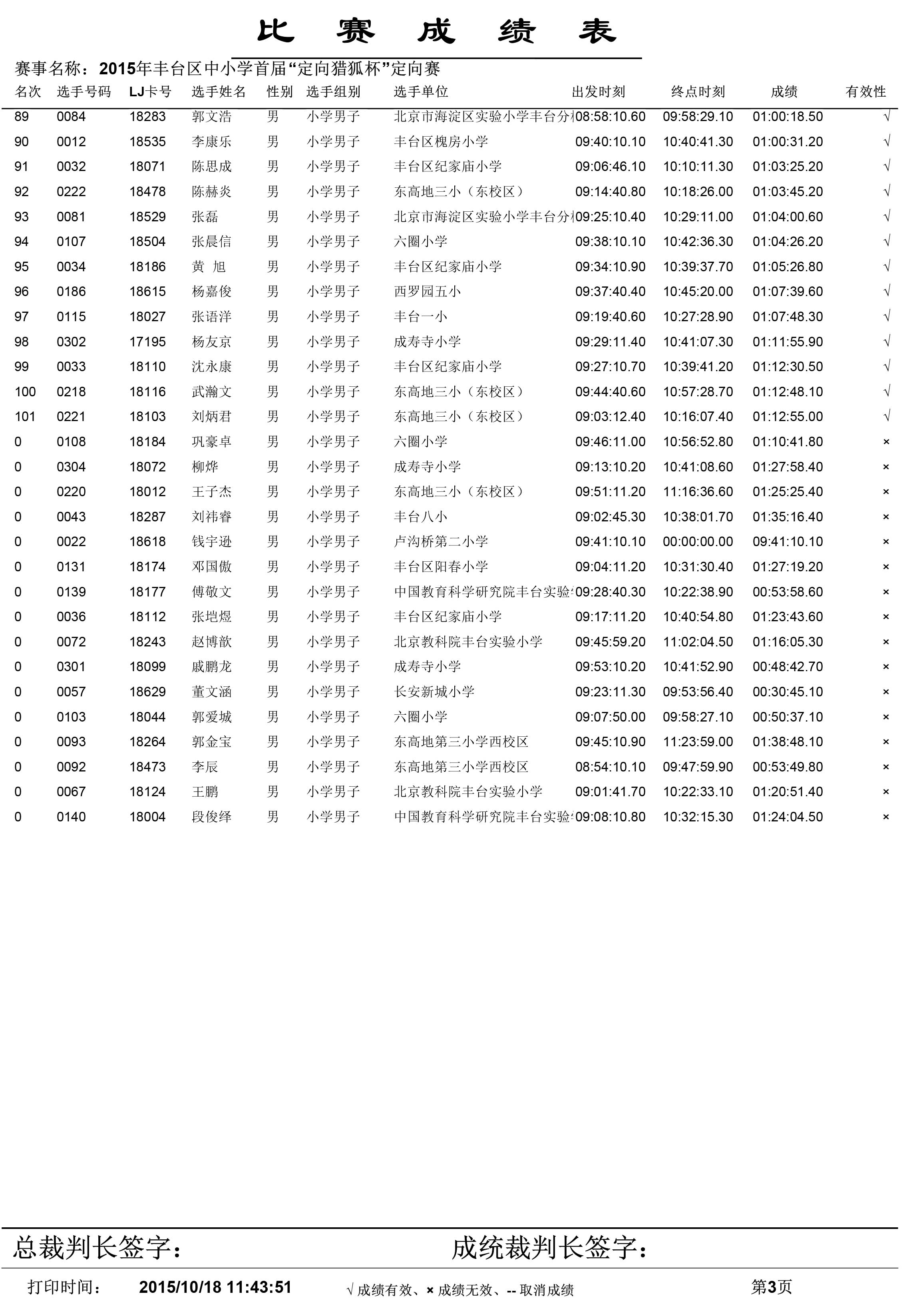 2015年丰台区中小学生首届“定向猎狐杯”定向越野锦标赛成绩单