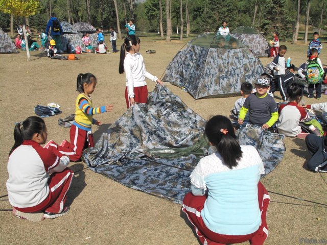 中午临近,各小组纷纷来到指定地点,进行野外搭帐篷的体验活动。大家分工合作,很快就搭起了帐篷,瞧!大家开心地在帐篷旁开始野餐。