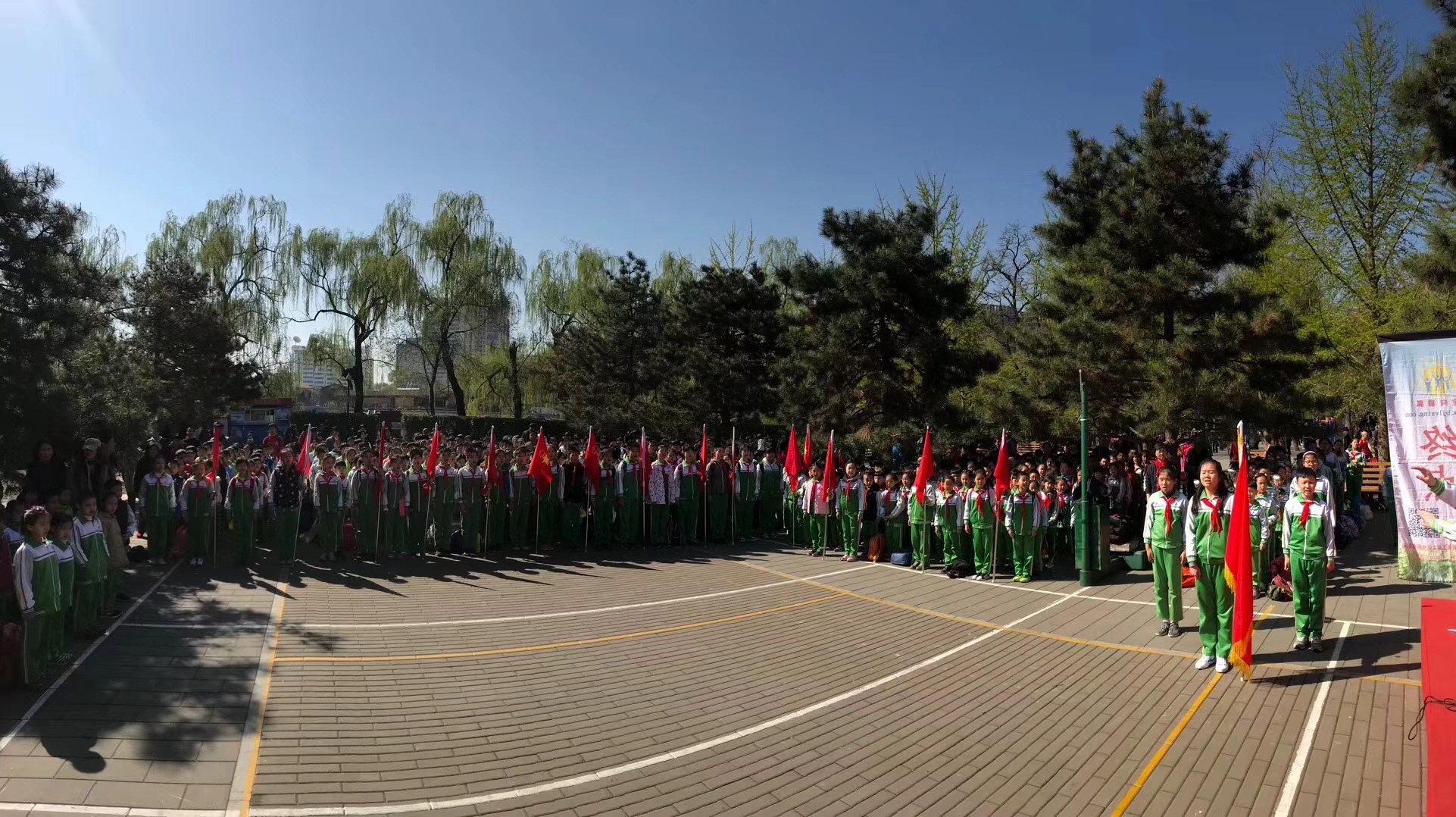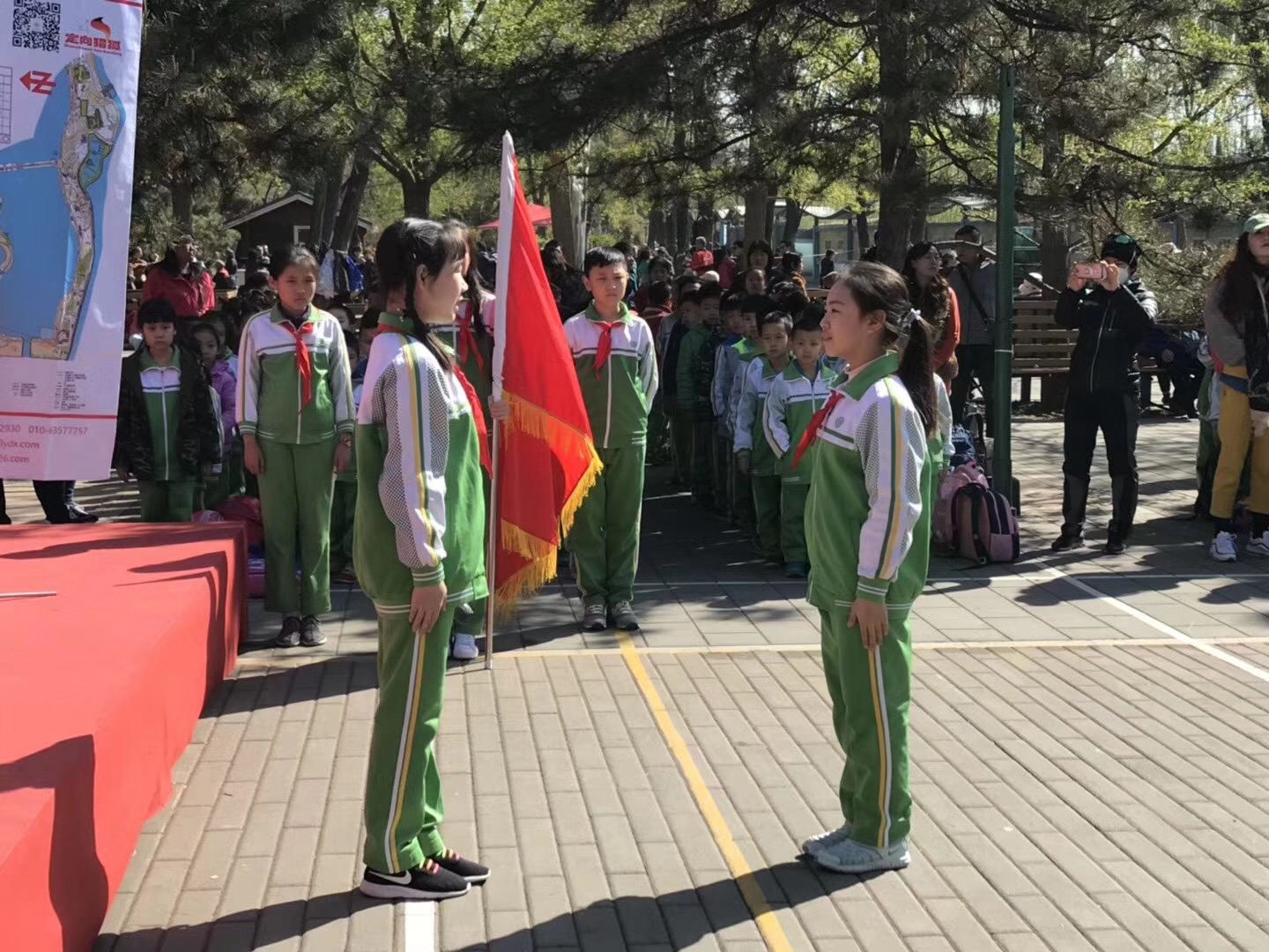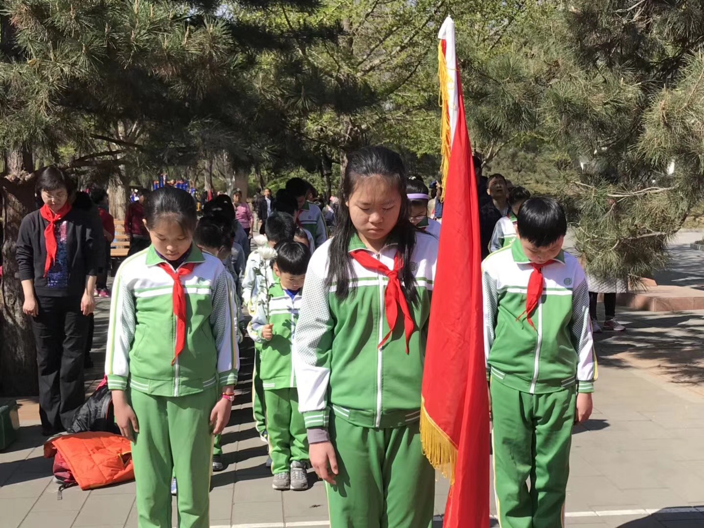 4月8日芳草地小学的同学们在张校长的带领下,来到中国少年英雄纪念碑前敬献鲜花!并进行了定向越野和无线电测向大手拉小手团队合作训练!