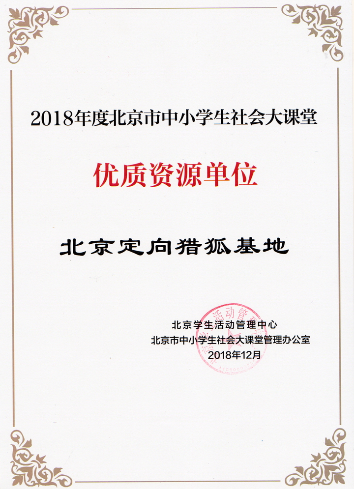 北京定向猎狐被北京市教委评为北京市中小学生社会大课堂优质资源单位!北京市1300多家资源单位中只有19家荣获此殊荣!2019年我们将再接再厉,以专业的品质、优质的服务、紧跟时代的主题再创佳绩!