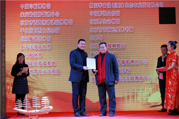 今年从1300多家中小学生社会大课堂资源单位当中,评选出19家优质资源单位,北京市中小学生社会大课堂管理办公室常务副主任高付元为优质资源单位颁奖。图为北京定向猎狐总经理孔繁金上台领奖。