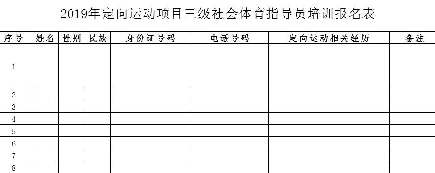 1.请填写培训报名表并于3月6日前将电子版报名表发至邮箱:bjdfly@126.com(邮件主题写“定向运动社会体育指导员培训班+姓名”),报名表内容及格式见下图: