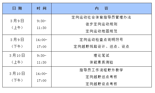 为推广普及定向运动知识,提高定向运动社会体育指导员队伍的水平,加强对定向运动社会体育指导员队伍的管理,做好后备人才的储备工作,完善上岗培训机制,定于2019年3月9日、10日举办定向运动社会体育指导员培训班。现将有关事宜通知如下: