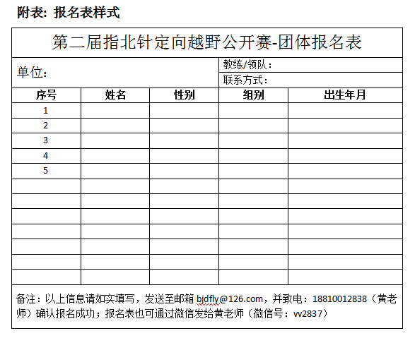 2、 团体报名表见附表,按要求填好后通过邮件或微信发给联系人。