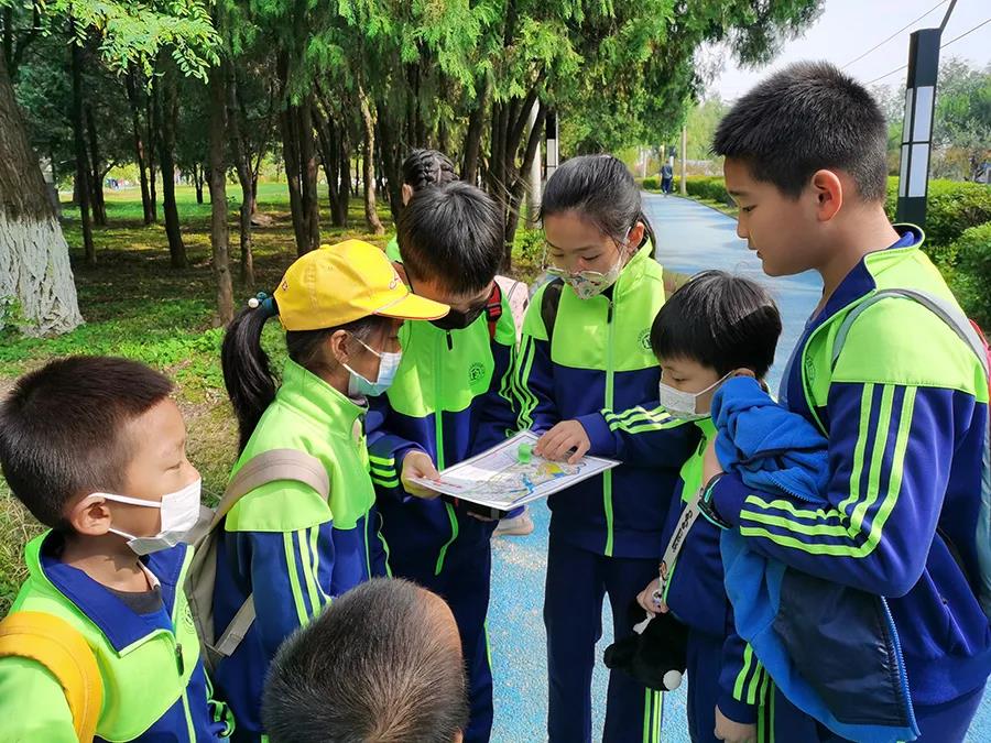 三、四年级的同学们在活动中认真看地图,寻找“狐狸”位置,很多小队在遇到问题时能够有商有量,相互照应,团结协作。“不能让弟弟妹妹们掉队,我们得拉好他们。”“行动前要有具体的方案,先明白我们要干什么,怎么干。不能盲目地,没有目标的乱找。”“我们在路上反复地来回,中间肯定哪里做得不对,之后得反思一下我们是怎么做的。”这是孩子们在活动中互相提醒、不断反思的对话。