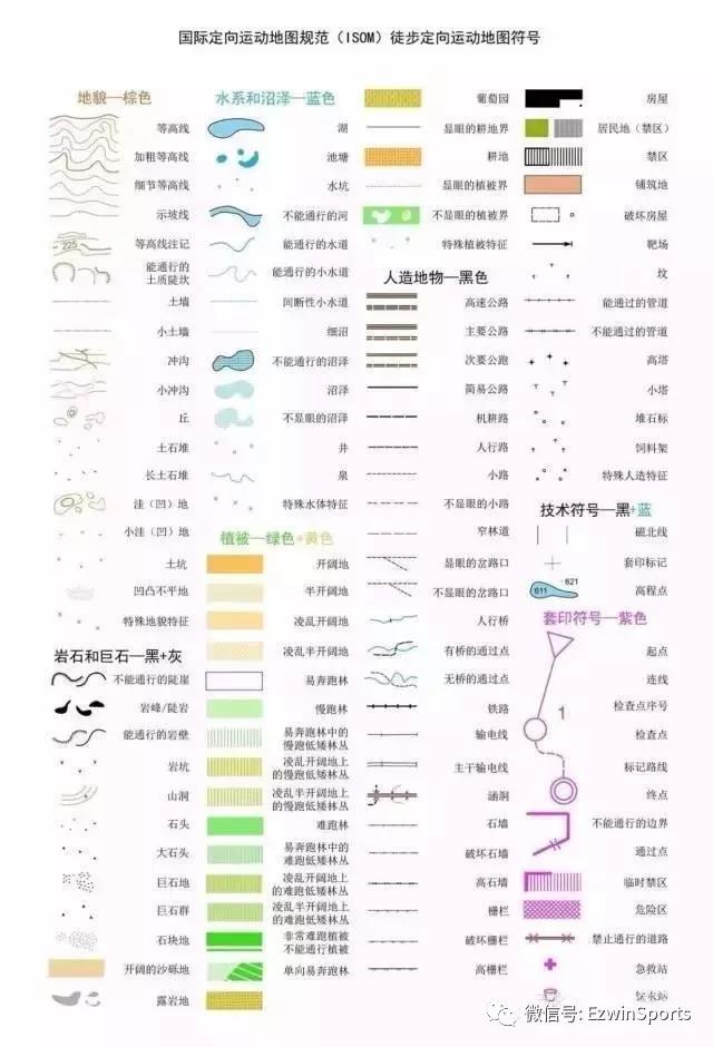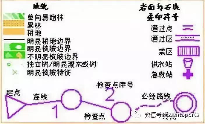 地图符号:在定向地图中,地图的符号有点状符号、线状符号、面状符号以及文字符号。