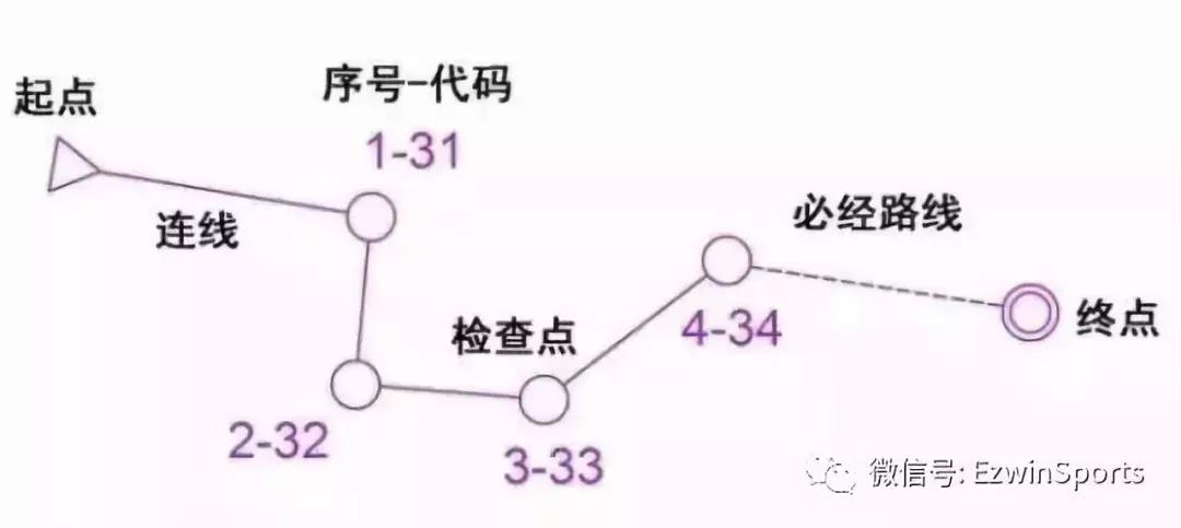 一条完整的比赛路线包含起点(用三角型表示)、若干检查点(用单圆圈表示)和终点(双圆圈表示),点与点之间的自由选择路线用实线表示,必须经过的路线用虚线表示。
