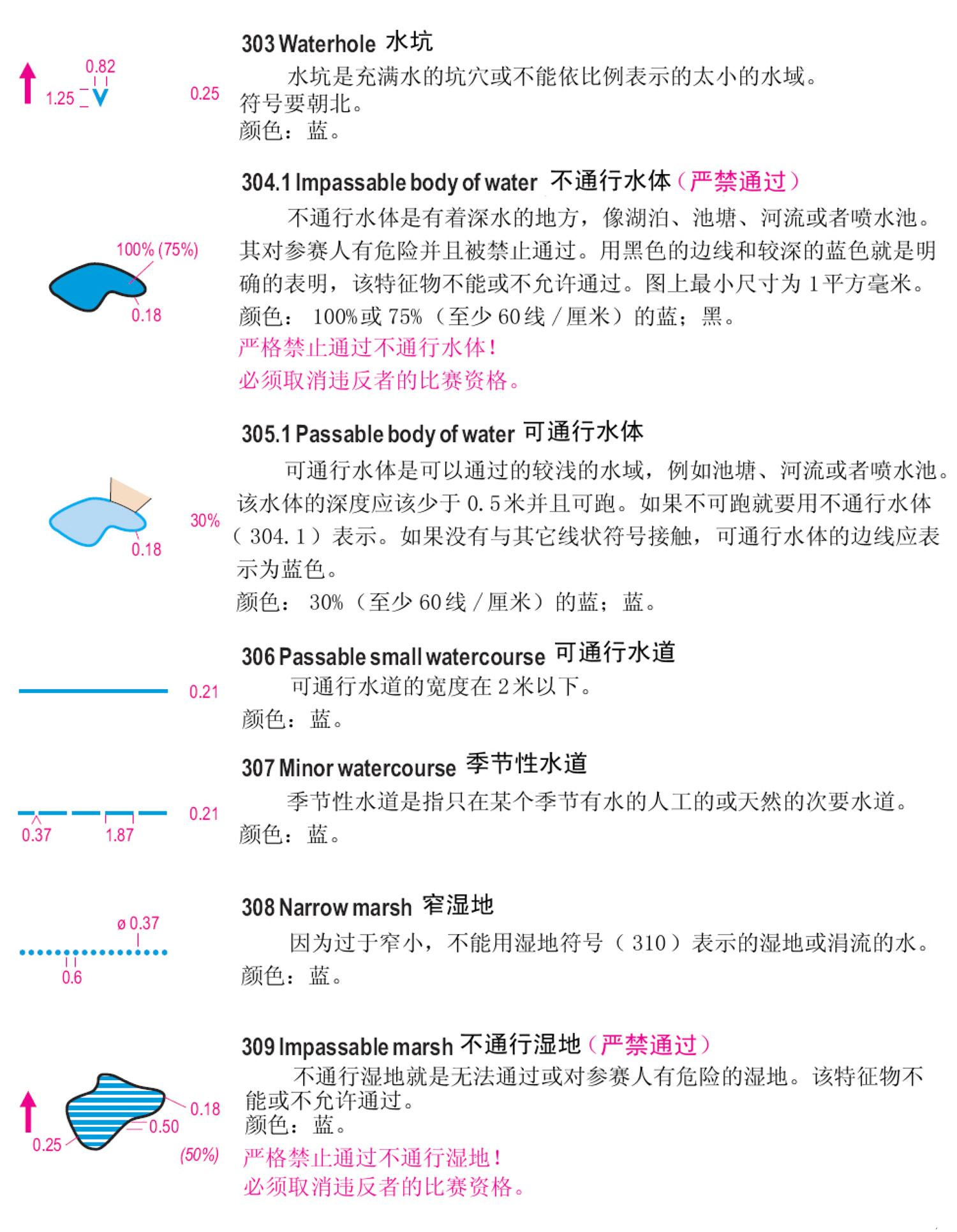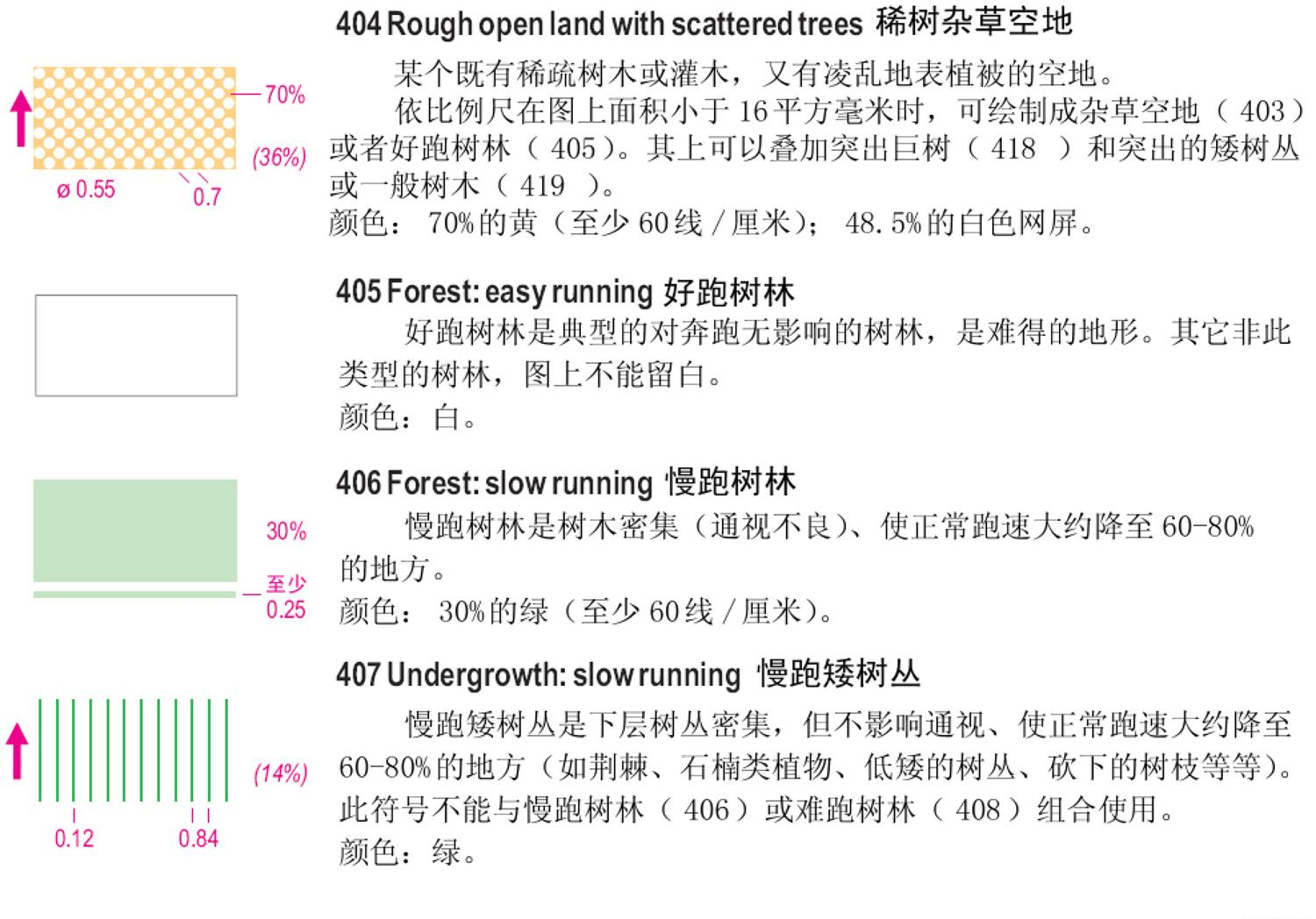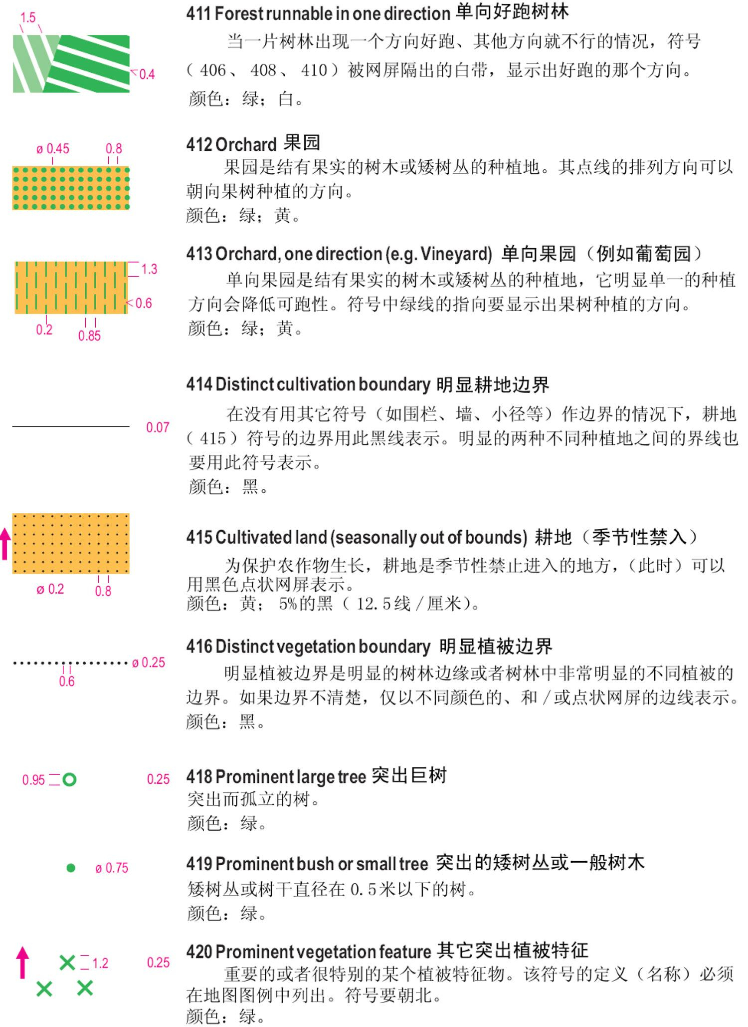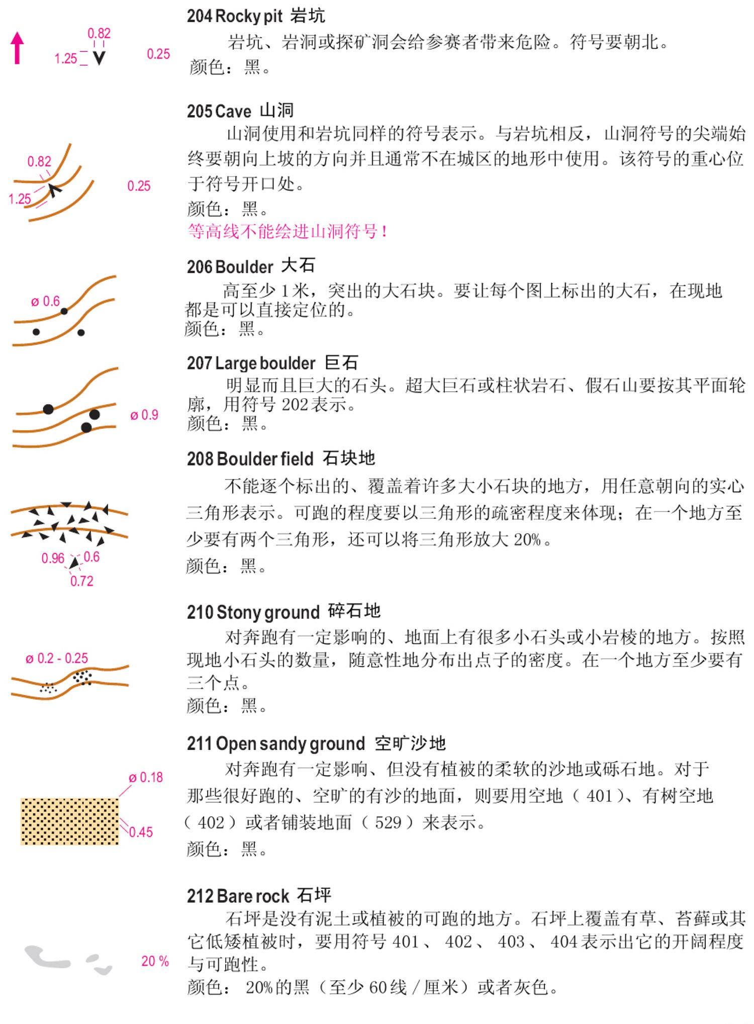 一、国际短距离定向运动地图规范(ISSOM)地图符号 二、国际定向运动地图规范(ISOM)徒步定向运动地图符号 三、下面以ISSOM2007标准说明: 1、地貌 2、岩石与石块 3、水系与湿地 4、植被 5、人造特征物 6、技术符号 7、套印符号 备注:符号详细