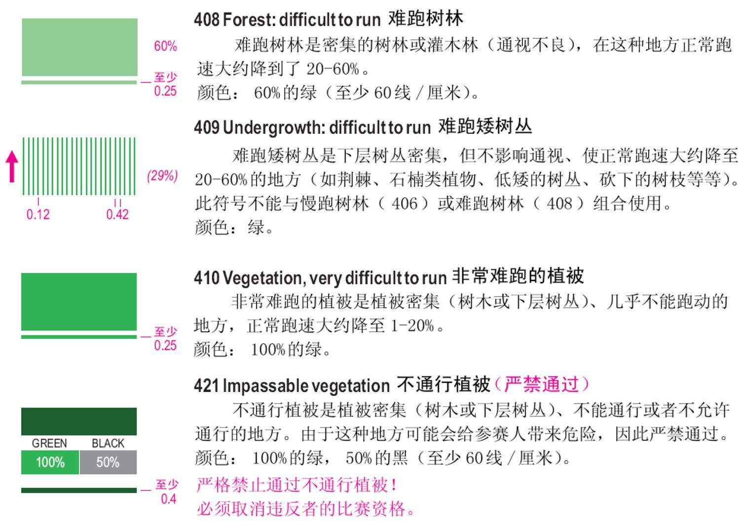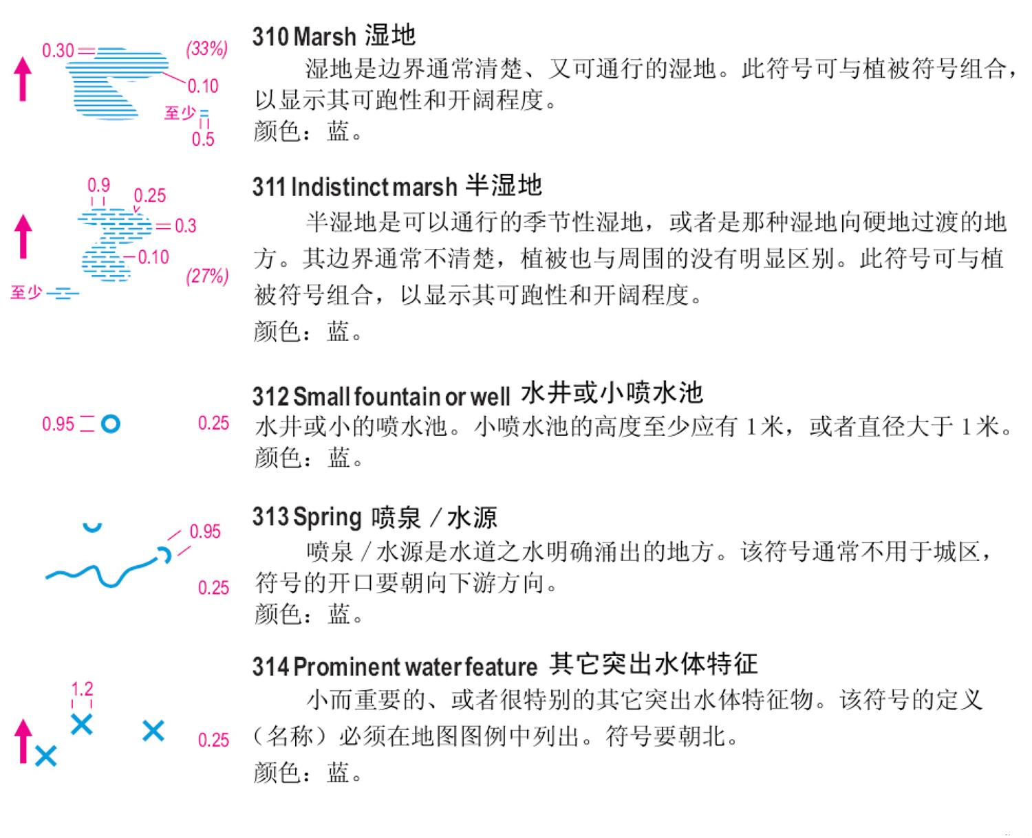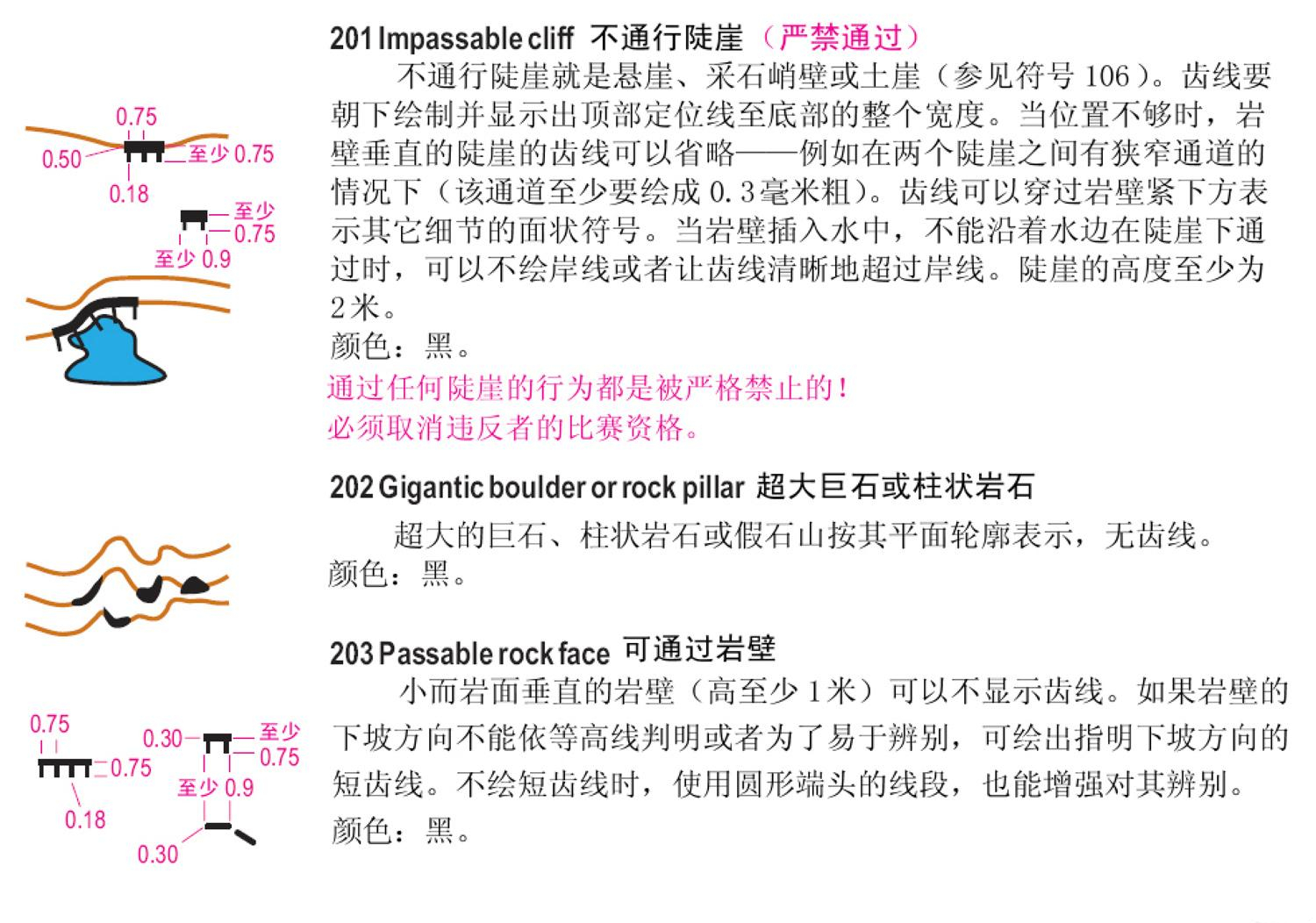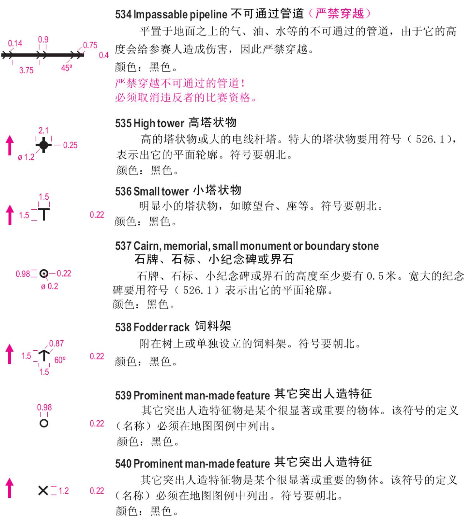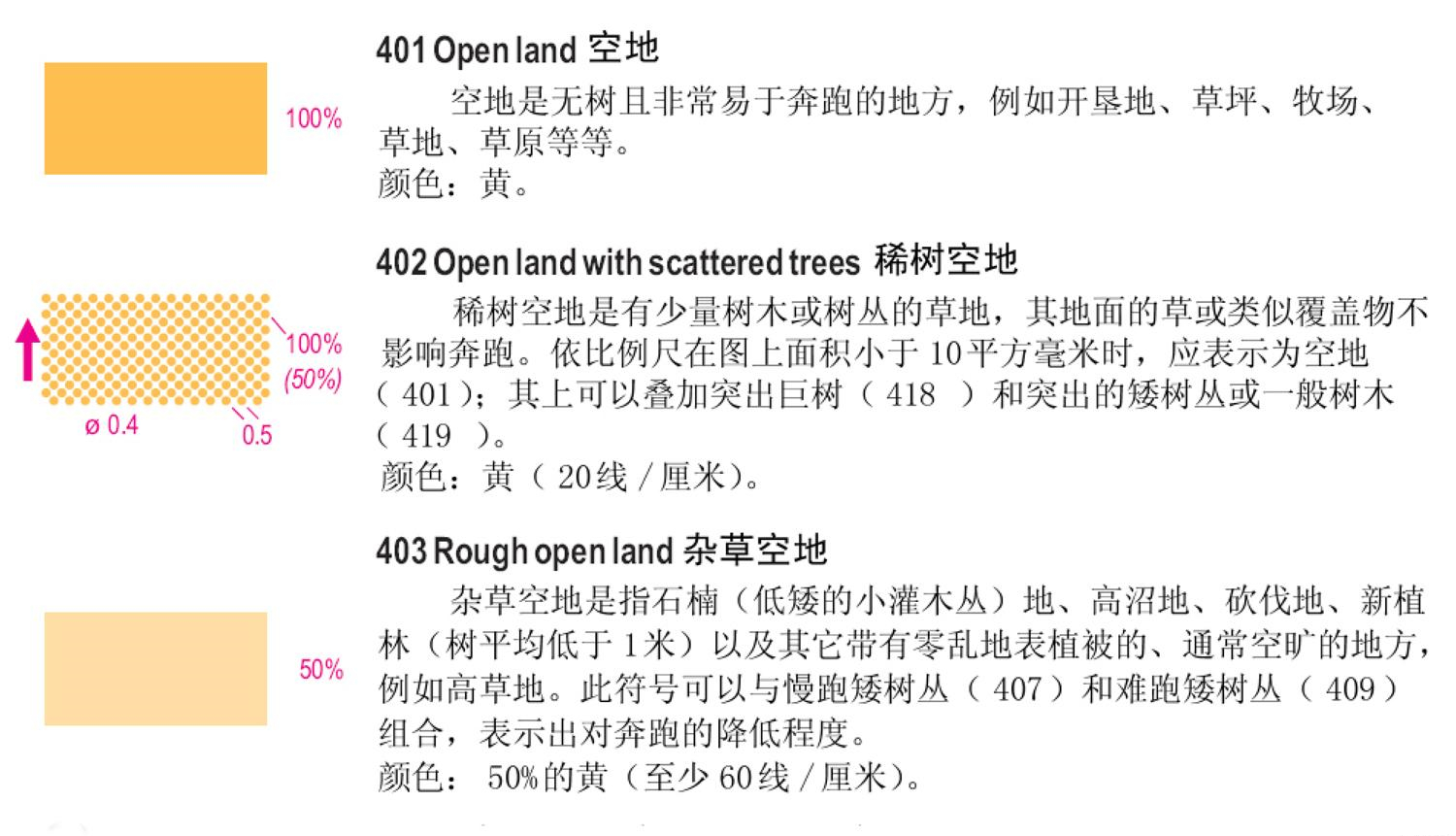 一、国际短距离定向运动地图规范(ISSOM)地图符号 二、国际定向运动地图规范(ISOM)徒步定向运动地图符号 三、下面以ISSOM2007标准说明: 1、地貌 2、岩石与石块 3、水系与湿地 4、植被 5、人造特征物 6、技术符号 7、套印符号 备注:符号详细