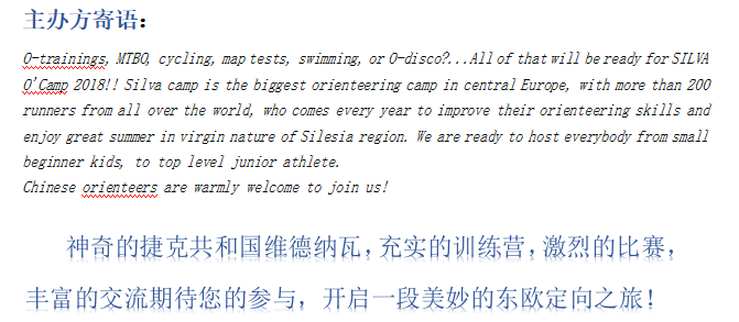 捷克Silva O'Camp国际定向邀请赛是中欧范围内,少有的训练比赛相结合的世界范围内参与的赛事,最大的特点是互动赛事体验,深度研学培训,通过赛前训练和为期3日的专业赛事为中国与欧洲的定向运动发展与交流提供了极佳的平台。