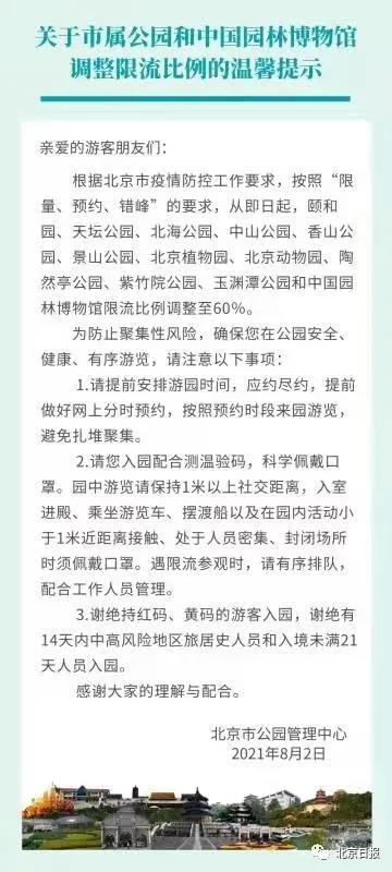 北京市公园管理中心发布信息,根据北京市疫情防控工作要求,按照“限量、预约、错峰”的要求,即日起,颐和园、天坛公园、北海公园、中山公园、香山公园、景山公园、北京植物园、北京动物园、陶然亭公园、紫竹院公园、玉渊潭公园和中国园林博物馆限流比例调整至60%。