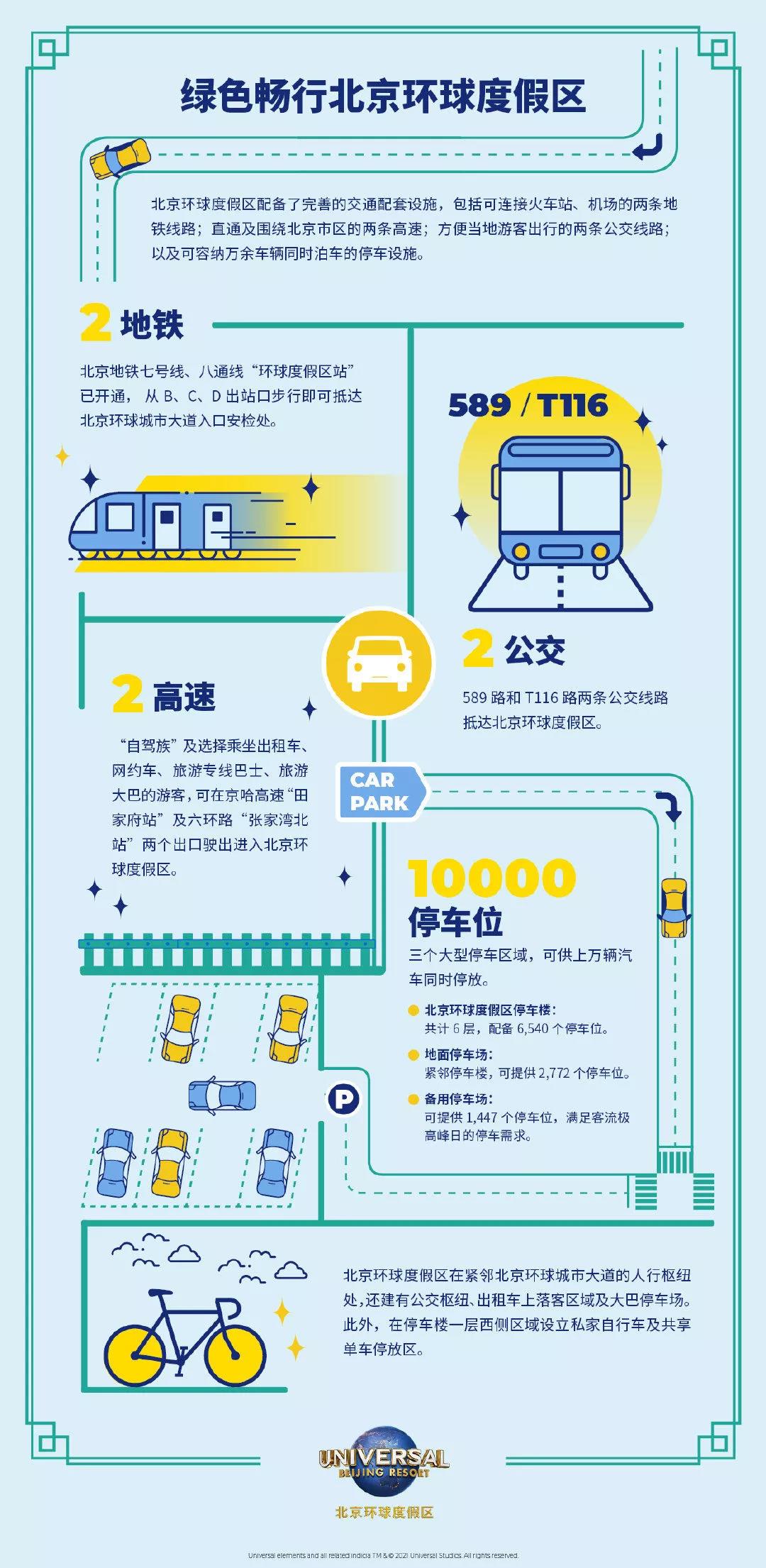 公交方面,游客可选择589路和T116路两条公交线路抵达北京环球度假区。