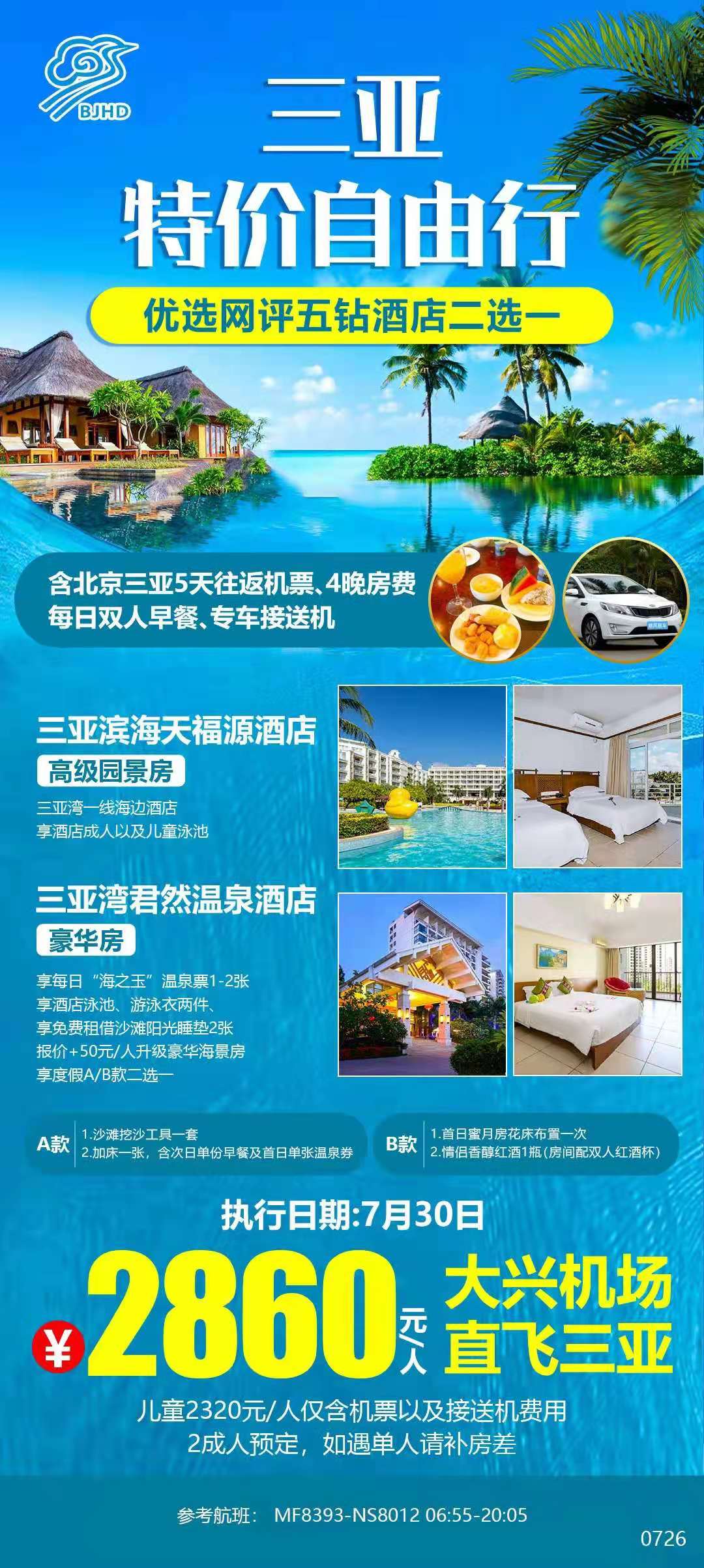 三亚自由行特价 大兴机场-三亚直飞 优选网评五钻酒店二选一 三亚湾一线海边/近海 尊享酒……
