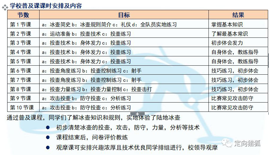 - 普及阶段,提升阶段及校内比赛是冰壶进校园的基础